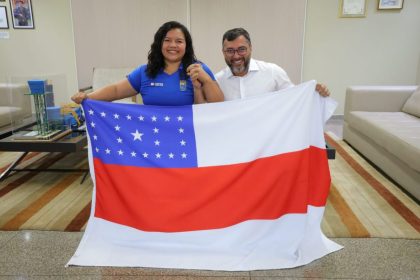 Paratleta do halterofilismo simboliza a força do esporte de alto rendimento com…