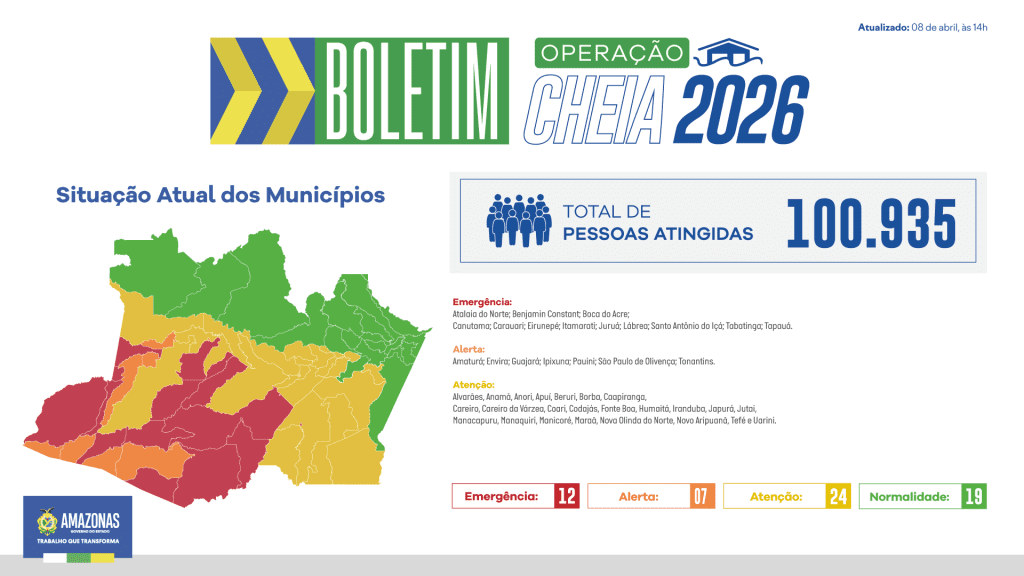 Outros 7 municípios estão em nível de alerta: Amaturá, Envira, Guajará, Ipixuna, Pauini, São Paulo de Olivença e Tonantins. Já em situação de atenção estão 24 municípios: Alvarães, Anamã, Anori, Apuí, Beruri, Borba, Caapiranga, Careiro, Careiro da Várzea, Coari, Codajás, Fonte Boa, Humaitá, Iranduba, Japurá, Jutaí, Manacapuru, Manaquiri, Manicoré, Maraã, Nova Olinda do Norte, Novo Aripuanã, Tefé e Uarini.