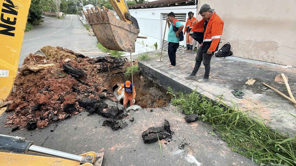 A equipe da Seminf identificou a abertura de um buraco na pista, o grande volume das águas das chuvas provocou a fuga de material do rompimento da tubulação. Após a escavação para fazer a remoção dos tubos danificados, uma nova estrutura foi implantada, garantindo mais segurança e durabilidade.
